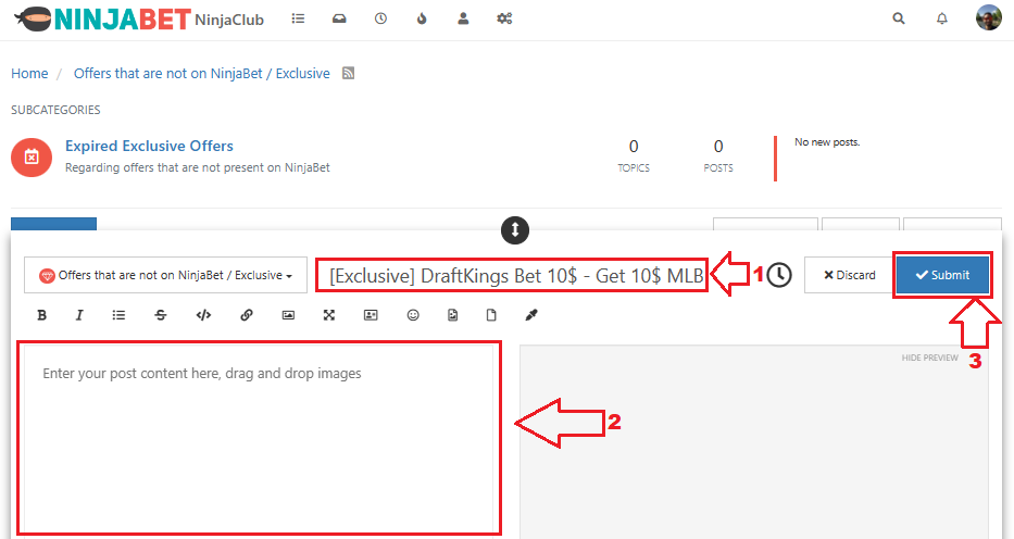 For example, if you get an Exclusive Offer (VIP), and after doing a search you find out that it hasn’t been published by anyone yet, you can go ahead and open a new thread (in the ‘Offers that are not on NinjaBet/Exclusive – VIP’ category) by clicking on the New Topic button.